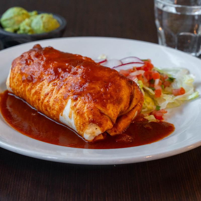 Flour tortilla, your choice of meat, cheese, beans, rice, and sour cream, topped with our Red or Green special sauce and melted cheese and garnished with pico de gallo.