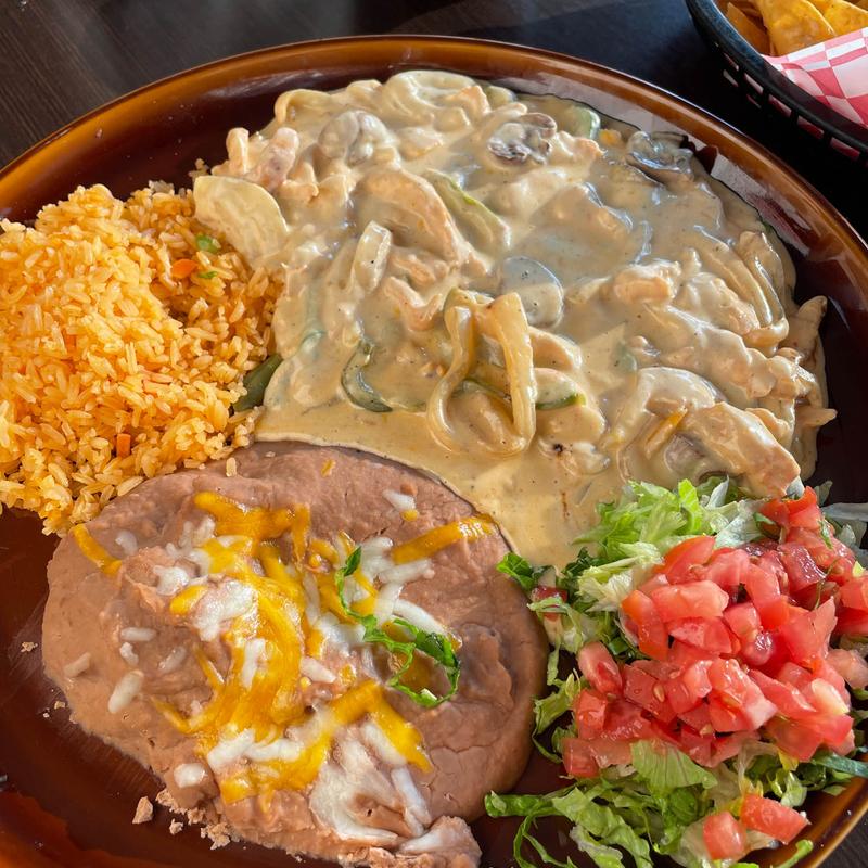 Tender chicken breast with mushrooms, in a creamy chipotle sauce, served with rice & beans.